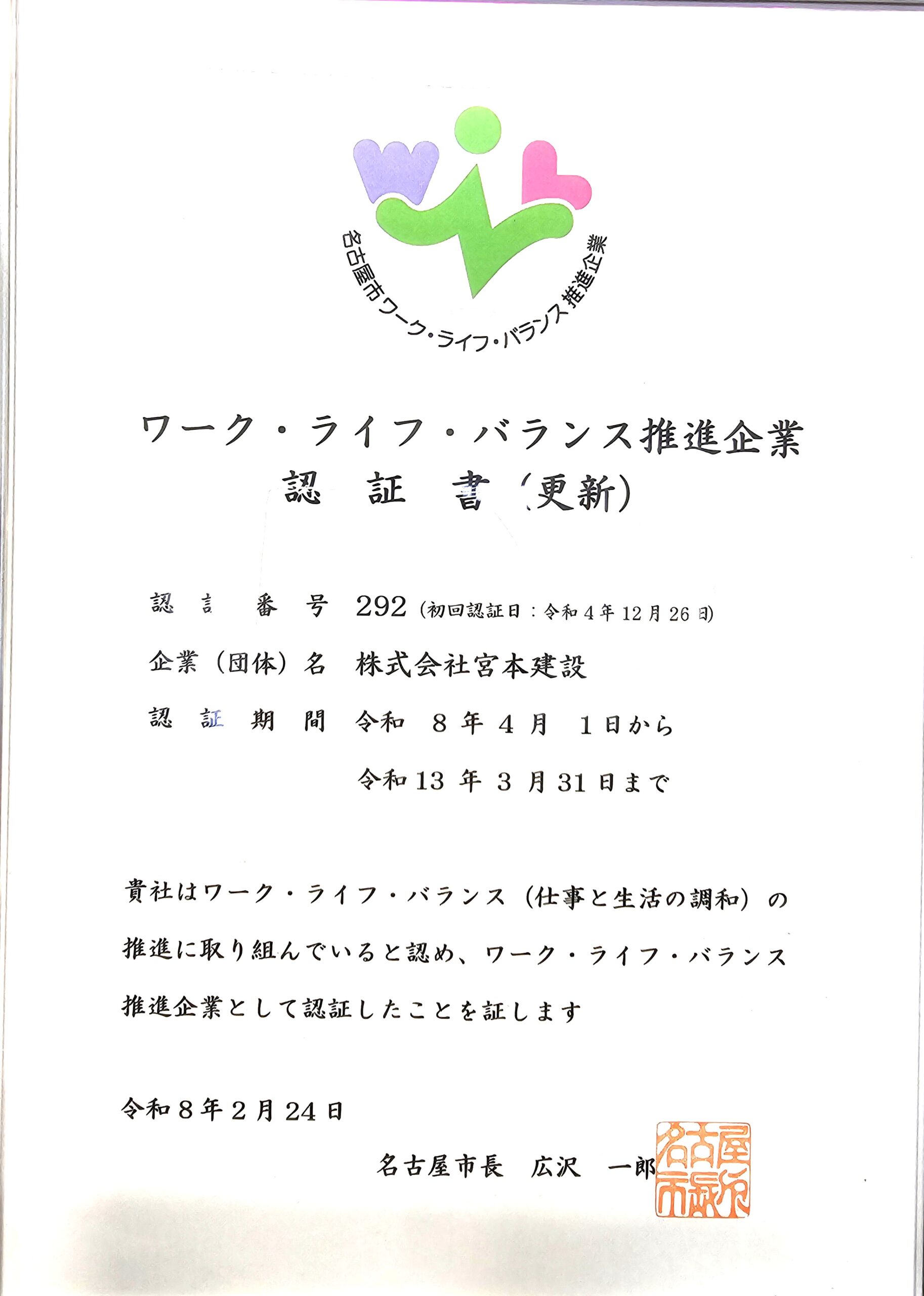 ワーク・ライフ・バランス推進企業の認定証を更新いたしました
