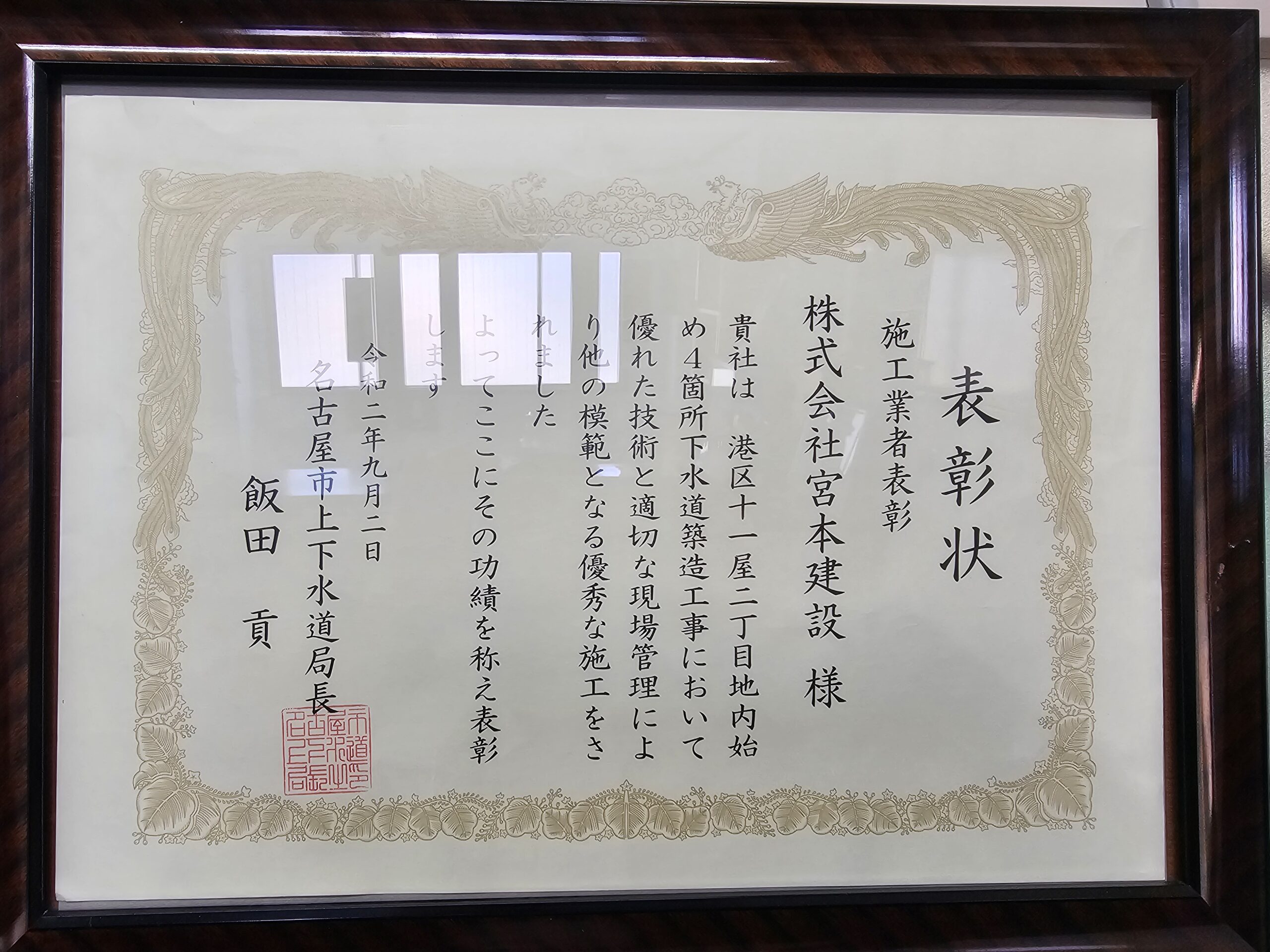 名古屋市上下水道局の優秀工事施工業者表彰をうけました。