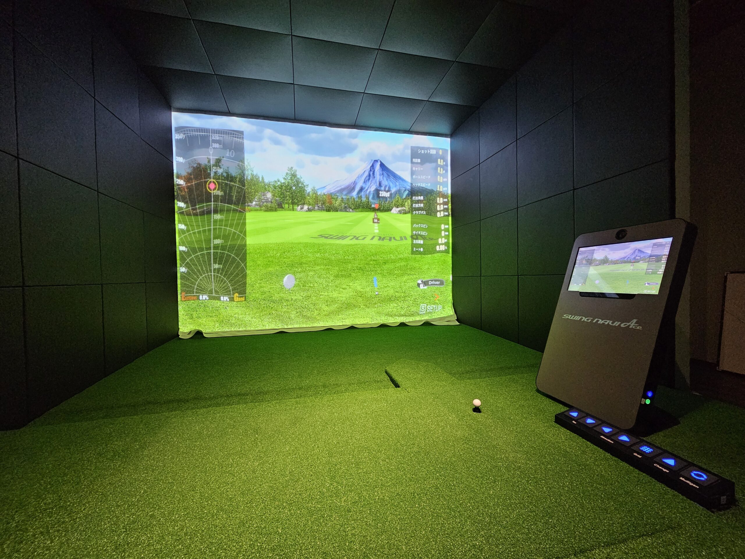 室内でもゴルフを楽しめる本格的な設備です。 シミュレーションでは、実在するゴルフ場のフィールドでプレイすることもできます。