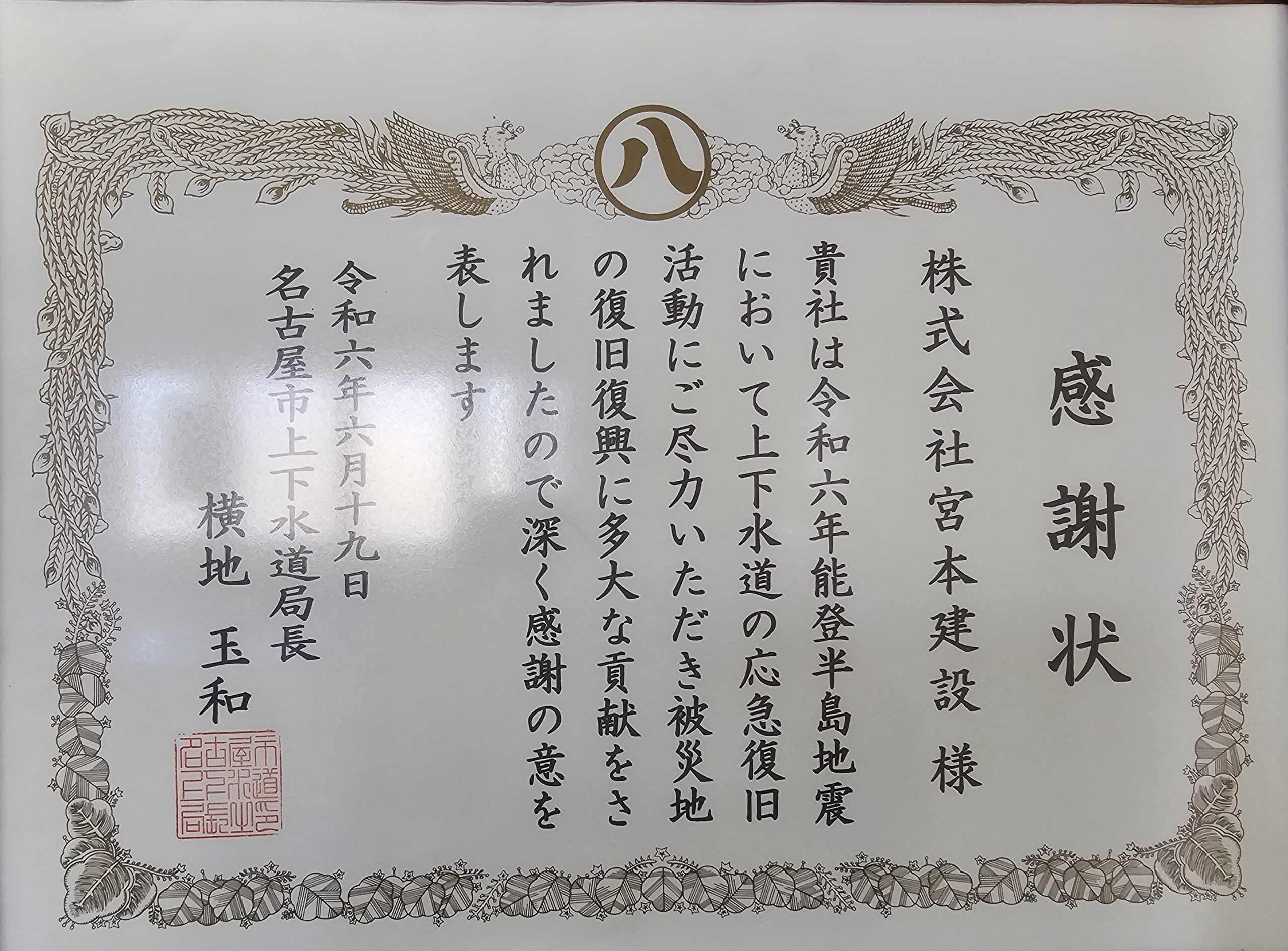 能登半島地震の応急復旧活動に対し、名古屋市上下水道局様より感謝状をいただきました。
